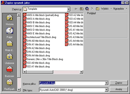Powiedzmy, że w ten sposób zakończyliśmy generowanie wszystkich elementów, które chcielibyśmy zachować jako w miarę niezmienne w każdym nowo otwartym projekcie. Teraz nie pozostaje nic innego, jak zapisać przygotowany plik w formie szablonu rysunkowego. Szablony rysunkowe w AutoCAD-zie mają rozszerzenie DWT, dlatego z takim rozszerzeniem zapiszemy nasz plik. Klikamy zatem kolejno Plik->Zapisz jako... i wówczas AutoCAD otwiera okno dialogowe zatytułowane Zapisz rysunek jako