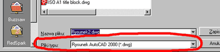 Jako że AutoCAD standardowo zapisuje pliki z rozszerzeniem DWG, musimy rozwinąć menu zatytułowane Pliki typu
