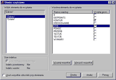 Jeśli więc zaznaczymy tę opcję, podczas otwierania pliku AutoCAD automatycznie zada nam pytanie w formie okna dialogowego, w którym możemy dokonać wyboru warstw, jakie chcemy wczytać częściowo.
