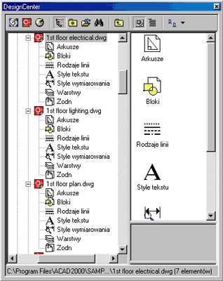 Jak widać, okno jest wzorowane na Eksploratorze Windows, co gwarantuje potrzebną nam funkcjonalność. Narzędzie jest odpowiednio podzielone na kilka sekcji, które możemy dowolnie włączać i wyłączać. Lewe okno CDP daje możliwość przeszukiwania katalogów pogrupowanych na odpowiednich dyskach. Pozwala również na wyświetlanie ich zawartości. CDP zostało tak zaprojektowane, aby niejako pomagać w wyszukiwaniu plików AutoCAD-a -- każdy z takich plików może zostać rozwinięty w lewym oknie i możemy wtedy zobaczyć cechy, jakie są do niego przypisane.
