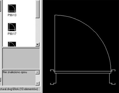 W ten sam sposób możemy przenosić warstwy z dowolnego pliku, jaki mamy. Dana warstwa wraz z jej ustawieniami zostanie przyłączona do nowego rysunku. W podobny sposób możemy dodawać do rysunku np. style tekstu czy style wymiarowania -- przeciągając je wprost do rysunku z CDP. Wykonując kilka ruchów myszą, oszczędzamy kilkadziesiąt minut pracy podczas tworzenia po raz kolejny jakiegoś rzadko używanego stylu. Najlepsza zabawa zaczyna się jednak po wybraniu cechy bloki. W prawej części CDP automatycznie pojawia się ich graficzna reprezentacja, często uzupełniona o odpowiedni opis -- lecz nie jest to konieczne.