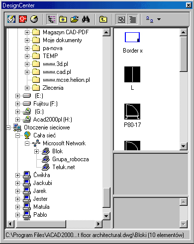 Jak już mówiłem, bloki oraz inne cechy możemy wstawiać z dowolnych plików praktycznie bez ograniczeń. Mam nadzieję, że przedstawiony powyżej prosty przykład przekonał Cię, drogi Czytelniku, do potęgi narzędzia Design Center (Centrum Danych Projektowych). Ułatwienia, jakie to narzędzie niesie ze sobą w codziennej pracy, na pewno zjednają mu jeszcze większą rzeszę zwolenników. Na zakończenie powiem jeszcze, że CDP pozwala również przeszukiwać sieć lokalną oraz mapowane dyski w celu znalezienia potrzebnego pliku.