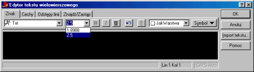 OK, teraz wiemy jak wstawiać ułamki, ale pozostaje pytanie: jak je edytować, kiedy są już wpisane? Nic prostszego-klikamy tekst zawierającym ułamek, pojawia się automatycznie okno Edytora tekstu wielowierszowego, następnie klikamy prawym klawiszem myszy edytowany ułamek i wybieramy opcję Cechy. Teraz w oknie dialogowym możemy dowolnie modyfikować ułamek.