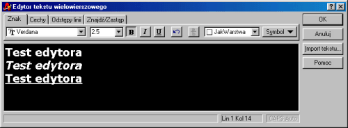 program automatycznie uruchamia Edytor tekstu wielowierszowego służący do wpisania odpowiedniego tekstu zapełniającego zaznaczony obszar.