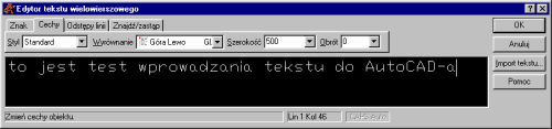 Jak widać na powyższym rysunku, istnieje wiele możliwości zmiany cech linii. Mimo to ja najczęściej używam tego właśnie okna do zmiany warstwy, na której linia jest aktualnie przechowywana. Znacznie więcej możliwości zmiany cech daje nam edycja tekstu. Oprócz umieszczenia tekstu na niewłaściwej warstwie, często występują błędy zwane literówkami i wtedy, moim zdaniem, najlepszym narzędziem edycji tekstu w celu jego poprawy jest zastosowanie Menedżera cech. Daje on możliwość edycji tekstu, zmiany jego wymiarów oraz stylu, w jakim dany tekst został napisany. Postarajmy się teraz wykonać ćwiczenie polegające na jednoczesnej zmianie kilku parametrów wprowadzonego tekstu. Zaczynamy od wprowadzenia tekstu z celowym błędem-ja dodam na końcu wiersza znaki ":)".