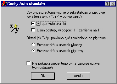 AutoCAD pozwala na autokonwersję wpisywanych liczb na ułamki. Jeśli pierwszy raz wpisujemy ciąg liczb oddzielonych znakiem /, ^ lub #, AutoCAD zadaje użytkownikowi pytanie odnośnie wprowadzania automatycznej zamiany liczb na ułamek-robi to w formie okna dialogowego. Proponuję w oknie tym przeprowadzić poniższe ustawienia.