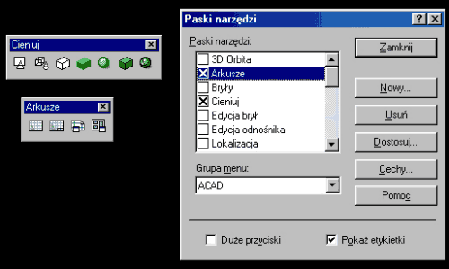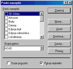 Dwie poprzednie lekcje opisywały w miarę dokładnie najczęściej używane narzędzia służące do edycji tekstu-teraz praktycznie znamy już wszystkie narzędzia edycyjne oraz wszystkie narzędzia rysunkowe wraz z tymi, które służą do edycji tekstu. Wiemy, z jakich narzędzi korzystamy najczęściej, więc dobrze byłoby je mieć stale na ekranie w postaci jednego paska narzędziowego lub pokazywać je i zwijać w zależności od potrzeb. Podczas tej lekcji pokażę jak wyciągać i chować paski narzędziowe, jak tworzyć własne paski i ikony oraz jak pójść jeszcze o krok dalej i pracować z wykorzystaniem danych zawartych w pliku acad.pgp. wyciąganie pasków narzędzi Zacznijmy więc od pokazania, w jaki sposób wyciągamy poszczególne standardowe paski narzędzi dostarczane wraz z AutoCAD-em. Aby nie przedłużać, klikamy kolejno Widok -> Paski narzędzi... i AutoCAD raczy nas okienkiem dialogowym przedstawionym poniżej.