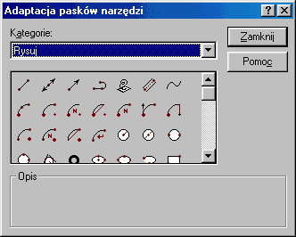 Teraz mamy pole do popisu, nie jesteśmy właściwie niczym skrępowani. Możemy dodawać do naszego paska praktycznie wszystkie ikonki, jakimi dysponuje AutoCAD oraz tworzyć swoje własne, do których podepniemy odpowiednie polecenia. Wstawianie ikonek do paska jest proste: klikamy klawisz Dostosuj w okienku Paski narzędzi i naszym oczom ukazuje się okno dialogowe zawierające wszystkie praktycznie ikony. Są one pogrupowane na istniejące paski narzędzi, co jeszcze bardziej ułatwia znalezienie właściwego narzędzia, które następnie przeniesiemy do naszego paska.