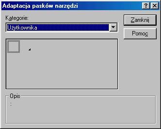 Usuwanie ikon z paska przeprowadzamy dokładnie w przeciwnym kierunku, z tą różnicą, że usuwając ikonki możemy przenosić je na obszar roboczy. Teraz zajmiemy się tworzeniem własnego przycisku. Mając otwarte okienko Paski narzędzi i uruchomiony nasz pasek narzędzi klikamy przycisk Dostosuj i w okienku Adaptacja pasków narzędzi znajdujemy pozycję Użytkownika w liście rozwijanej Kategorie
