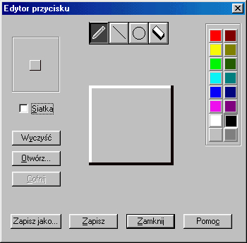 W kolejnym kroku klikamy nasz nowy pusty klawisz prawym przyciskiem myszy. Otwiera się okienko dialogowe pozwalające nadać nazwę nowemu przyciskowi, uruchomić odpowiednie narzędzie oraz edytor graficzny, który zastosujemy do rysowania po przycisku.