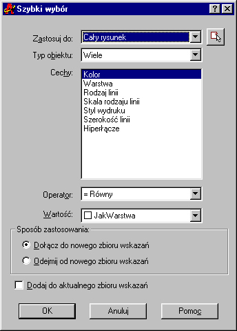 Nie trzeba już chyba przekonywać nikogo, że słuszną decyzją było poświęcenie całej lekcji temu jednemu poleceniu. Ale warto omówić jeszcze jedną zaletę tego narzędzia. Otóż Menedżer cech posiada pewne bardzo użyteczne narzędzie, a mianowicie Szybki wybór. Co to takiego? Wyobraźcie sobie bardzo skomplikowany projekt z całym mnóstwem warstw i umieszczonych na nich obiektów. Szef wymyślił sobie zmianę dowolnej cechy wszystkich tekstów na rysunku. I co? Nie wystarczy przecież usiąść i płakać. W takiej sytuacji należy skorzystać właśnie z narzędzia Szybki wybór, znajdującego się w oknie Menedżera cech. Aby uruchomić to narzędzie, należy kliknąć ikonę.