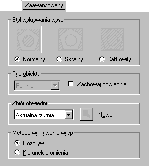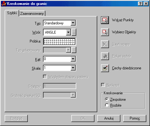 Jak widać, zakładka ta umożliwia określenie stylu wykrywania tzw. wysp, czyli obszarów, które mają zostać zakreskowane (lub nie). Styl Normalny umożliwia kreskowanie wnętrza obszaru wyznaczonego przez obwiednię. Styl Skrajny umożliwia kreskowanie tylko obszaru ograniczonego obwiednią zewnętrzną i pierwszą napotkaną obwiednią wewnętrzną. Styl Całkowity umożliwia kreskowanie całego obszaru, niezależnie od obwiedni wewnętrznych. Warto przetestować te opcje, ponieważ mogą one przyspieszyć prace projektowe-proponuję włączyć Styl Normalny i przejść do zakładki szybkiego kreskowania. Spójrzmy jeszcze na przyciski znajdujące się po prawej stronie okna. Właściwie będziemy korzystać jedynie z dwu pierwszych, więc jedynie z nimi zapoznamy się bliżej. Jeden z nich to Wskaż punkty