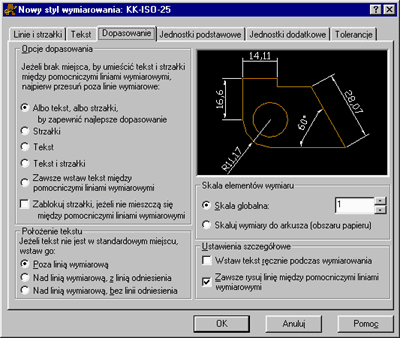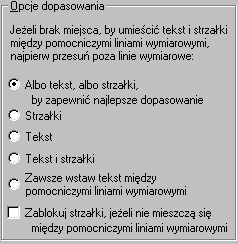 Pozostałe zakładki są raczej rzadko używane, ale warto wiedzieć, do czego służą-ta wiedza może okazać się przydatna. Kontynuujmy więc rozważania o stylu wymiarowania. Zakładka Dopasowanie pozwala na zmianę parametrów związanych z odpowiednim ustawieniem tekstu wymiarowego w przypadku, gdy brakuje miejsca na wstawienie standardowego tekstu.