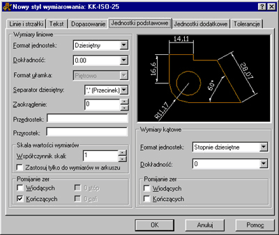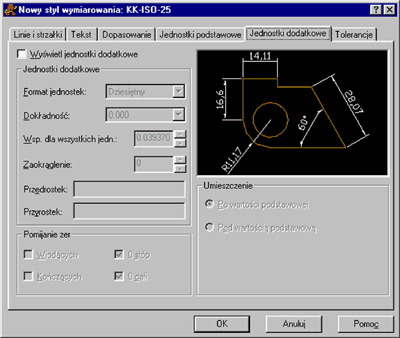 Kolejna zakładka, Jednostki podstawowe, jest związana z określeniem formatu jednostek wymiarowania. Zakładka ta służy w całości do ustalenia takich parametrów jak dokładność wymiarów (liczba miejsc po przecinku) czy wygląd separatora dziesiętnego.