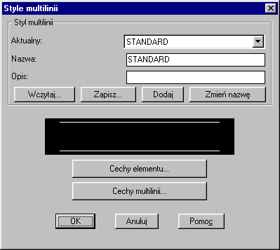 Kiedy mamy już utworzony nowy styl, nadszedł czas na dokonanie zmian w jego wyglądzie. Służą do tego przyciski znajdujące się pod rysunkiem przedstawiającym aktualny wygląd multilinii. Po wciśnięciu przycisku Cechy elementu... generowane jest okno dialogowe, pozwalające na dodawanie linii do aktualnie tworzonego stylu (multilinia może składać się np. z 4 linii), na zmianę koloru poszczególnych linii czy zmianę ich rodzaju, np. na linię przerywaną.