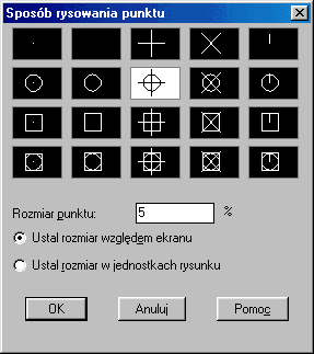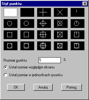Ćwiczenie tego typu zmobilizuje Cię, Czytelniku, do przejrzenia właściwie wszystkich opcji Stylu multilinii styl punktu Kolejnym stylem, który pragnę omówić, będzie styl punktu. Jest to chyba najprostszy styl, jakim dysponuje AutoCAD. Do jego określenia służy jedno okno dialogowe, które pozwala na określenie np. wyglądu stawianego punktu oraz jego rozmiaru w jednostkach bezwzględnych lub dopasowanych do rozmiaru ekranu.