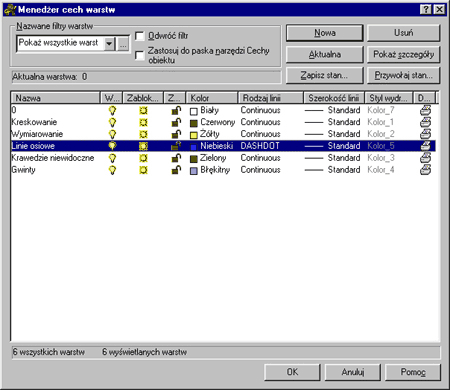 Poprzednie lekcje pokazywały, jakie parametry można ustawić przy pomocy edycji stylów. Przypomnijmy, że ustawialiśmy styl wymiarowania, styl tekstu itd. Dlaczego wspomniane lekcje były takie ważne? Otóż, wiadomości zawarte w tych lekcjach będą teraz wykorzystywane przez nas do wykonania szablonu pliku projektowego. Taki szablon można przygotować raz, stosując tak zwaną "burzę mózgów" w celu ustalenia jego wszystkich elementów. Następnie umieszczamy taki plik w ustalonym miejscu w sieci i każdy pracownik biura projektowego ma do niego swobodny dostęp. Wszystkie lekcje, które do tej pory przestudiowaliśmy, miały na celu ograniczenie pracochłonności tworzenia projektu. Dzisiejsza lekcja będzie niejako zwieńczeniem poprzednich. Nie wydłużając wstępu w nieskończoność, proponuję zabrać się do konkretnej pracy. Najpierw ustalimy, co ma zawierać nasz szablon rysunkowy. Na pewno jedną z najważniejszych rzeczy przy tworzeniu szablonu rysunkowego dla biura projektowego jest ustalenie kolorów warstw i wszystkich parametrów z nimi związanych. Zacznijmy więc od tego punktu. Otwieramy nowy rysunek i zakładamy sobie komplet używanych warstw-wraz z przypisaniem im odpowiednich parametrów związanych z kolorem oraz rodzajem linii. Mój szablon rysunkowy będzie zawierał jedynie kilka podstawowych warstw, lecz można przygotować taką ich ilość, jaka będzie potrzebna w danym biurze. Zagadnienie zakładania warstw zostało omówione w lekcji 12. (kurs dla początkujących), dlatego w tym miejscu pokażę tylko wynik założenia przeze mnie warstw.