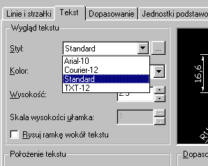 Po wykonaniu stylów tekstu przyszedł czas na styl wymiarowania. Proponuję przygotowanie jednego stylu o nazwie odpowiedniej dla jego zawartości, przy czym będzie on obejmował większość zawiłości potrzebnych podczas wymiarowana danego rysunku. Jako że nie jesteśmy w stanie przewidzieć wszystkich wariantów, proponuję po prostu dorabianie odpowiednich stylów wymiarowania opartych na tym podstawowym, jaki sobie utworzymy. Tak więc klikamy Format->Styl wymiarowania... i do pracy. Warto zauważyć, że zasady rządzące stylem wymiarowania zostały omówione w lekcji 6. tego kursu, dlatego w tym miejscu pokażę jedynie kilka elementów, które na 100% przydadzą się podczas późniejszej pracy z szablonem i samym projektem. Pierwszym elementem, jaki zmienimy w naszym własnym stylu wymiarowym, będzie parametr znajdujący się w zakładce Tekst, a mianowicie Styl. Parametr ten zostanie automatycznie ustawiony na jeden ze zdefiniowanych wcześniej stylów tekstu.