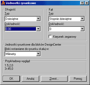 Kolejnymi elementami, jakie zostaną określone podczas tworzenia naszego własnego szablonu rysunkowego, będą jednostki rysunkowe oraz ich typ i miara kątowa. Aby określić jednostki rysunkowe, klikamy kolejno Format->Jednostki.... AutoCAD automatycznie wyświetla okno dialogowe, które pozwala na edycję podstawowych parametrów jednostek rysunkowych. Proponuję dokonać ustawień jednostek, podobnych do tych przedstawionych na poniższym rysunku.