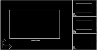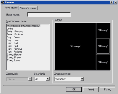 Zauważmy, że wybór odpowiedniego rodzaju rzutni jest intuicyjny i odpowiednio zilustrowany. Wybieramy odpowiadającą nam konfigurację, a wówczas AutoCAD automatycznie wstawi wybrany przez nas układ rzutni. Aby powrócić do starego układu z jedną rzutnią, klikamy odpowiednio Widok->Rzutnie->1 rzutnia. Należy zauważyć, że rzutnia gotowa do edycji jest zaznaczona białą obwódką.