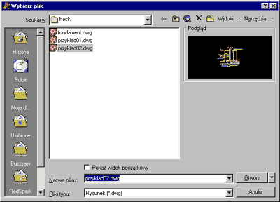 Teraz mamy już wszystko, aby zacząć zabawę z częściowym otwieraniem rysunku. Tak więc klikamy kolejno Plik->Otwórz i AutoCAD przywita nas poniższym oknem dialogowym.