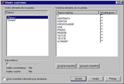 Jeśli więc zaznaczymy tę opcję, podczas otwierania pliku AutoCAD automatycznie zada nam pytanie w formie okna dialogowego, w którym możemy dokonać wyboru warstw, jakie chcemy wczytać częściowo.