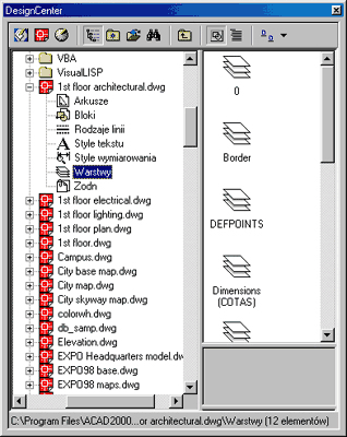 Ktoś może powiedzieć: "Ładnie to wygląda, ale jak z tego praktycznie korzystać podczas codziennej pracy projektowej?". Aby nie przeciągać opisów teoretycznych, wykonajmy małe ćwiczonko, które pozwoli utrwalić wiedzę na temat CDP Otwórzmy zatem nowy rysunek. Następnie otwórzmy CDP. W kolejnym kroku znajdźmy katalog z naszymi rysunkami lub rysunkami przykładowymi, dostarczonymi do AutoCAD-a. Robimy to w lewym oknie, stosując narzędzia znane nam z Eksploratora Windows. Wyszukujemy jeden z plików, z którego będziemy czerpali materiał do naszego nowego dzieła. Rozwijamy jego cechy i klikamy najpierw na warstwach.
