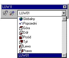 Przy użyciu rozwijanego menu, dostępnego z poziomu paska narzędzi LUW II, możemy się przełączać pomiędzy stworzonymi układami współrzędnych.
