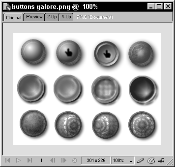 Bez względu na technikę użytą do utworzenia oddzielnych obrazków rollovera, najlepszy efekt uzyskasz zawsze poprzez stosowanie do nich subtelnych modyfikacji. Jeśli jeden z przycisków będzie się bardzo różnił od pozostałych stanów, wyraźnie będzie widać moment zamiany grafiki, co spowoduje utratę wrażenia pojedynczego klikniętego lub wyróżnionego przycisku. Zamiast tego, użytkownik zobaczy jedynie zmianę jednego obrazka na inny. Najlepiej w rolloverach wyglądają niewielkie zmiany położenia lub wyglądu grafiki (rysunek 21.3).
