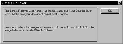 Rysunek 21.4. "Okno dialogowe" Simple Rollover zawiera jedynie informacje o działaniu behawiora, nie oferując żadnych opcji. Na tym właśnie polega prostota tego behawiora |