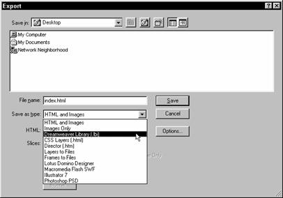 20. Z listy Save as type (Save As) wybierz HTML and Images, aby eksportować HTML, lub wybierz Dreamweaver Library (.lbi), aby eksportować HTML jako bibliotekę Dreamweavera.