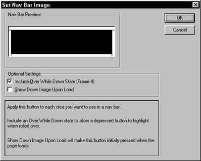 u Set Nav Bar Image (Nav Bar Over, Nav Bar Down, Nav Bar Restore) (Ustaw obrazek paska nawigacyjnego (Pasek nawigacyjny pod kursorem, Wciśnięty pasek nawigacyjny, Przywróć obrazek paska nawigacyjnego). Grupa behawiorów definiujących stany elementów paska nawigacyjnego, które znajdują się w zaznaczonych plastrach.