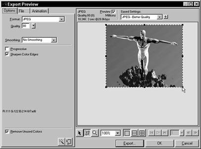 eksportu obrazków za pomocą okna dialogowego Export Preview można je łatwo skalować i kadrować.