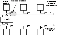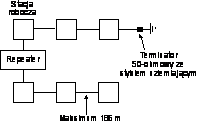 W przypadkach, kiedy wykorzystywany jest przewód koncentryczny, stacje robocze łączy się w szereg (magistrala). Segmenty przyłącza się tak jak to pokazano na rysunku: