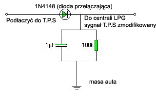 Napięcie z T.P.S. podawane jest na diodę przełączającą która zabezpiecza przed napięciem powrotnym. Kondensator ładuje się napięciem z T.P.S. a rezystor ustala czas rozładowania kondensatora w przypadku chwilowego zaniku sygnału napięcie zgromadzone jest podawane do centrali LPG ( dioda w tej chwili stanowi zaporę aby aby napięcie nie przedostało się do złącza T.P.S.). Układ do T.P.S. analogowego dodatniego |