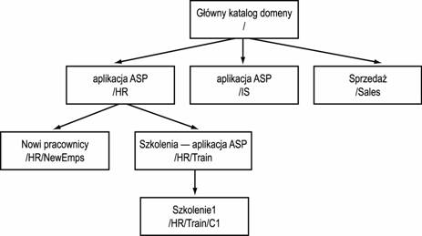 Powiedzieliśmy również, że podkatalogi są częścią aplikacji, o ile nie stanowią swojej własnej aplikacji ASP. W katalogu HR znajduje się katalog o nazwie NewEmps. Nie jest on aplikacją ASP, tak więc każda strona w nim się znajdująca należy do aplikacji HR. Jeśli katalog NewEmps zawiera w sobie jakieś podkatalogi, one również będą składnikami aplikacji ASP, chyba że zostały zdefiniowane jako własna, odrębna aplikacja ASP.