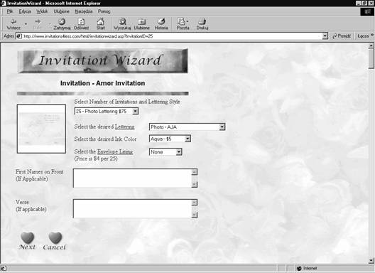 Weź pod uwagę stronę e-commerce. Rysunek 8.12. przedstawia prawdziwą stronę, którą administruję. Strona pokazana na rysunku jest częścią kreatora zamówień. Zapytuje ona gości o konieczne szczegóły na temat zamawianego produktu. Strona w dużym stopniu bazuje na obiekcie Session w celu śledzenia poczynań gości tak, aby w ich koszyku znalazły się właściwe produkty, jak to widać w kodzie tej strony: