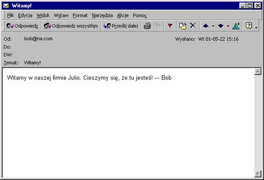 "Witamy!", "Witamy wszystkich w firmie. Cieszymy się z waszej obecności! --- Bob"