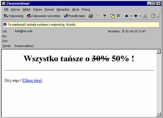 Pamiętaj jednak, że nie wszystkie programy poczty elektronicznej potrafią przeglądać wiadomości HTML. Niektóre z nich mogą wyświetlić jedynie tekst wiadomości podobny do tego pokazanego na rysunku 9.7. Program próbuje tutaj pokazać tekst wiadomości, zauważ jednak jak zmieniło się jej znaczenie. W dokumencie HTML skreśliliśmy 30% na rzecz 50%. Tutaj nie widać tej różnicy.