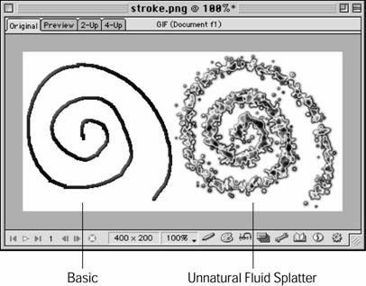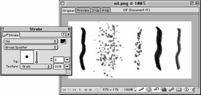 Oil (Farba)Patrząc na pięć różnych typów obrysu Oil (rysunek 8.12), trudno jest uwierzyć, że drugi obrys od lewej - Broad Splatter (Rozrzucone plamy farby) - jest pojedynczym obrysem. Mimo że ma on tylko 10 pikseli grubości - podobnie jak obrysy Bristle (Pędzel z ostrym włosiem) i Splatter (Plamy farby) (tabela 8.8) - wygląda na szerszy. Dzieje się tak dlatego, że używa jednocześnie dwóch końcówek, oddalonych od siebie o 500% szerokości obrysu. Innymi słowy, obrys Broad Splatter może być pięć razy szerszy od swojej zdefiniowanej grubości. Wszystkie obrysy Oil, z wyjątkiem typu Splatter, używają wielu końcówek. Ponieważ jednak odległości pomiędzy końcówkami są ustawione na 100% szerokości obrysu, wyglądają jak pojedyncze linie.