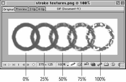 Tekstury to desenie bitmapowe nakładane na obrysy. Suwak Amount of texture steruje stopniem krycia tekstury. Przy wartości 0%, tekstura jest całkowicie przezroczysta i niewidoczna. Przy natężeniu wynoszącym 100%, tekstura jest maksymalnie widoczna. Na rysunku 8.4 znajduje się obrys z różnymi ustawieniami tej samej tekstury. Zwykle lepiej widoczne są tekstury, które zawierają kontrastujące ze sobą elementy, zaś tekstury o mniejszym kontraście są bardziej delikatne i przydatne jedynie w przypadku bardzo grubych obrysów.