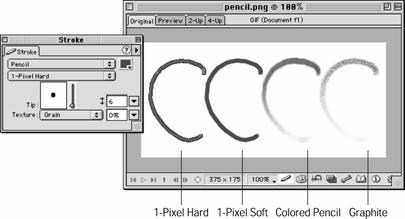W tym podrozdziale znajdziesz opisy wszystkich kategorii obrysów i oferowanych przez nie różnych ustawień. Lista kategorii obrysów Fireworks rozpoczyna się od dwóch podstawowych: Pencil (Ołówek) i Basic (Podstawowy). Następnie wymienione są alfabetycznie kolejne obrysy: od Air Brush (Aerograf) do Unnatural (Nienaturalny). Ogólna zasada jest taka, że standardowe, czyli najczęściej wykorzystywane obrysy to te, które znajdują się u góry listy, zaś w jej dolnej części znajdują się dekoracyjne obrysy o bardziej wyszukanych konstrukcjach. Pencil (Ołówek)Po narysowaniu ścieżki za pomocą narzędzia Pencil (Ołówek), przypisywany do niej jest obrys Pencil typu 1-Pixel Hard (Twardy 1-pikselowy ołówek). Dzieje się tak niezależnie od tego, jakich ustawień obrysu używałeś przy pracy z innymi narzędziami. Jeśli nie zdefiniujesz nowych ustawień obrysu przed użyciem narzędzia Brush (Pędzel), również zostanie zastosowany obrys Pencil 1-Pixel Hard. Można powiedzieć, że obrys Pencil jest prawdziwym "wołem roboczym" wśród wszystkich wbudowanych obrysów. Pencil jest prostym obrysem, przeznaczonym jedynie do reprezentacji ścieżek. Nie posiada żadnych elementów ozdobnych. W tabeli 8.1 i na rysunku 8.5 przedstawione zostały różnice pomiędzy czterema typami obrysu Pencil. Obrys 1-Pixel Soft Pencil (Miękki 1-pikselowy ołówek) wygładza ścieżki, aby zapobiec ich strzępieniu, występującemu w przypadku ścieżek z obrysem 1-Pixel Hard Pencil. Obrys Colored Pencil (Kolorowy ołówek) o grubości 4 pikseli jest nieco szerszy i jest przeznaczony do pracy z narzędziami reagującymi na nacisk i prędkość rysowania. Działa więc tak samo, jak tradycyjny ołówek. Ostatni typ ołówka - Graphite (Grafitowy) również reaguje na nacisk i prędkość rysowania. Dodatkowo przypisana jest do niego tekstura o wysokim natężeniu symulująca ziarno grafitu.