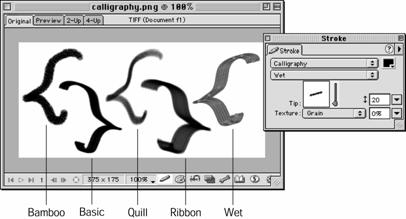 Calligraphy (Kaligraficzny)Kaligraficzny obrys doskonale się sprawdza przy tworzeniu odręcznych rysunków, w których szerokość obrysu jest uzależniona od zakrzywienia ścieżki. Fireworks oferuje pięć różnych typów obrysu Calligraphy (tabela 8.4 i rysunek 8.8). Jedynie obrys typu Bamboo (Bambus) nie tworzy krzywych o zróżnicowanych grubościach. Dzieje się tak dlatego, że pozostałe cztery typy kaligraficznego obrysu wykorzystują pochyloną końcówkę pędzla, zaś obrys Bamboo jest okrągły (jak łodyga bambusa). Obrys typu Quill (Gęsie pióro) jest wrażliwy na nacisk i prędkość rysowania oraz, podobnie jak Ribbon (Wstążka) i Wet (Mokry), pogrubia ścieżki na zakrzywieniach, akcentując ich kąty. Tabela 8.4. Atrybuty obrysów Calligraphy