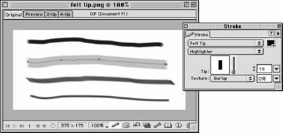 Kredka typu Rake (Grabki) ma mały rozmiar obrysu, ale wygląda, jakby była grubsza niż dwa inne typy: Basic (Podstawowa) i Thick (Gruba). Różnica ta wynika z tego, że kredka typu Rake wykorzystuje cztery końcówki. Działa to tak, jakbyś rysował czterema kredkami jednocześnie. Z powodu stosowania czterech końcówek, linie tworzone kredką typu Rake nakładają się na siebie, w wyniku czego jedna z nich może być przeciągnięta dalej niż pozostałe. Felt Tip (Marker)Cztery typy obrysów z kategorii Felt Tip (rysunek 8.11) oferują różne poziomy przezroczystości, co pozwala imitować rysowanie tradycyjnym markerem.