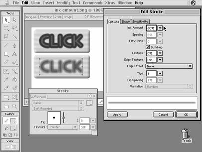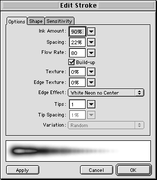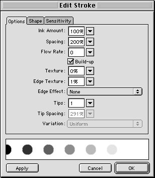Ink Amount (Ilość atramentu)Pierwszy atrybut obrysu w zakładce Options to Ink Amount. Przeważnie jest on ustawiany na 100 procent, ale możesz zmienić jego wartość dla dowolnego obrysu. Wartość Ink Amount jest odpowiedzialna za stopień krycia obrysu: 100% to kompletne krycie, zaś 0% daje pełną przezroczystość. Dolny przycisk "CLICK" znajdujący się na rysunku 8.19 pokazuje, jak wygląda obrys przy wartości parametru Ink Amount wynoszącej 60%. Za pomocą palety Object można również modyfikować stopień krycia całych obiektów, ale parametr Ink Amount umożliwia jedynie modyfikację obrysu. Zmiany obu parametrów są uwzględniane równolegle, co oznacza, że jeśli parametr Ink Amount obrysu ma wartość 50% i na taką samą wartość ustawisz w palecie Object krycie obiektu, obrys będzie miał w rezultacie krycie wynoszące 25% (ponieważ połowa 50% to 25%). Dobrym przykładem obrysu wykorzystującego zredukowane wartości parametru Ink Amount w celu uzyskania przezroczystości jest obrys Felt Tip Highlighter Spacing (Odstępy)W praktyce każdy obrys składa się z długich serii stempli obrysu. Stempel jest najmniejszym fragmentem obrysu. Aby zobaczyć jak to wygląda, wybierz jakiś obrys i kliknij raz narzędziem Brush. Podczas przeciągania narzędziem Brush lub jakimkolwiek innym, poszczególne stemple będą umieszczane jeden za drugim. Za odległości pomiędzy stemplami odpowiedzialny jest parametr Spacing. W jednym z kolejnych podrozdziałów dowiesz się, jak poprzez zmiany parametru Spacing, możesz tworzyć linie kropkowane.