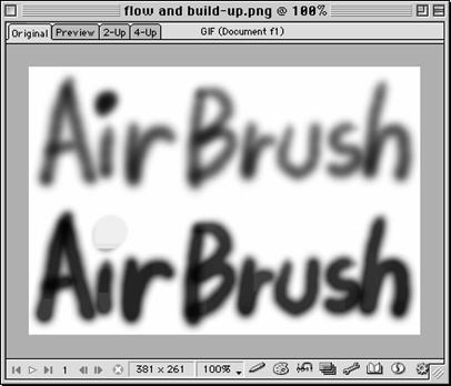 Hard line - Linia twarda Hard line Rounded - Linia twarda z zaokrąglonymi końcówkami Soft Line - Linia miękka Soft Line Rounded - Linia miękka z zaokrąglonymi końcówkami Air Brush (Aerograf)Przyznaję się - jestem uzależniony od aerografu. Stale używam wszystkich odmian obrysu Air Brush, jakie oferuje Fireworks. Oba typy aerografu (tabela 8.3) są bardzo czułe na nacisk oraz prędkość rysowania i, jak w przypadku tradycyjnego aerografu, dłuższe przytrzymanie narzędzia w jednym miejscu powoduje nałożenie większych ilości farby (rysunek 8.7).