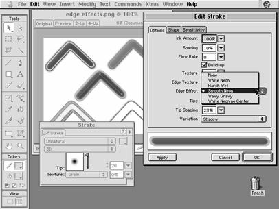 Oprócz modyfikowania tekstury krawędzi obrysu, możesz tworzyć także efekty krawędzi (Edge Effect). Efekty krawędzi są tworzone poprzez zastosowanie algorytmu oddziałującego na kanał alfa samego obrysu i jego krawędzi. Powyższy opis nie oddaje jednak w pełni intrygujących rezultatów, do jakich prowadzi zastosowanie efektów krawędzi (rysunek 8.22). Efekty krawędzi są uzależnione od przezroczystości krawędzi obrysu, więc nie możesz zastosować efektu do obrysu, dla którego wartość parametru Edge Softness wynosi 0%. Tips