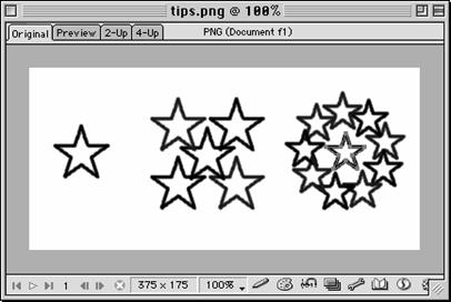 Rysunek 8.23. W każdej grafice została narysowana pojedyncza gwiazda, choć może wydawać się, że w dwóch z nich wykorzystano klonowanie obiektów. Wykorzystanie wielu końcówek i wysoka wartość parametru Tip Spacing pozwalają tworzyć wiele identycznie wyglądających obrazków za pomocą tylko jednego obrysu |