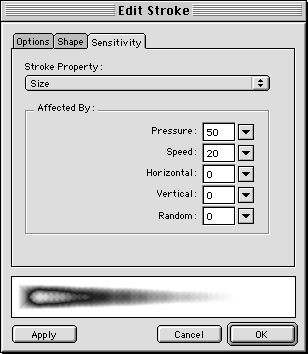 Rysunek 8.25. Za pomocą zakładki Sensitivity okna dialogowego Edit Stroke możesz tworzyć interaktywne obrysy |