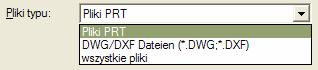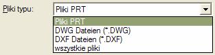 Posługując się poleceniem do wczytywania rysunku można (oprócz formatu PRT) - bez konieczności oddzielnej konwersji - wczytać plik DWG lub DXF. W trakcie wczytywania MegaCAD wykonuje konwersję pliku do formatu PRT. Z konwertera, do konwersji pobiera parametry, jakie były w nim ostatnio ustawione. Przy wczytywaniu należy w lewym dolnym narożu okienka dialogowego (rys. poniżej) wybrać typ wczytywanego pliku.